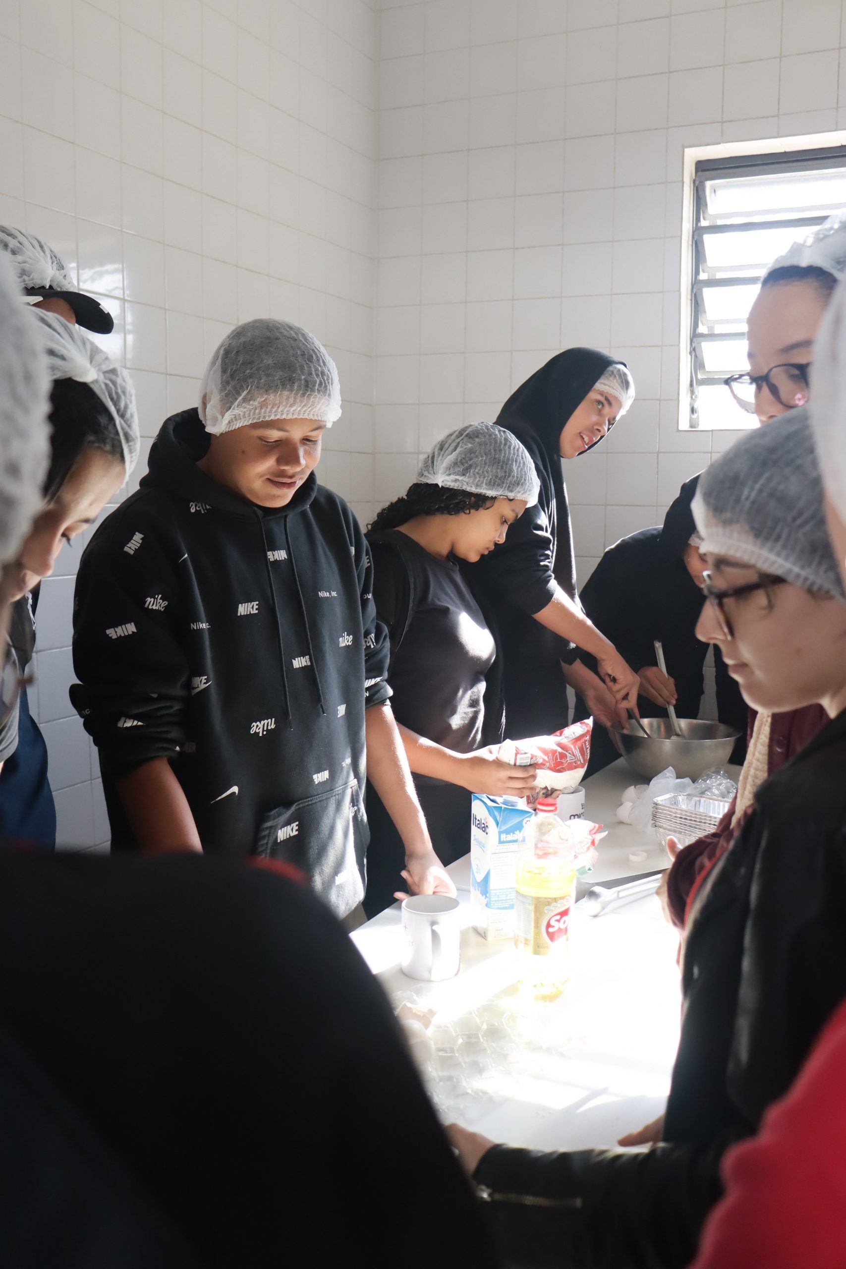 As experiências fora da instituição foram complementadas por oficinas criativas realizadas no próprio Lar, nas quais os alunos puderam colocar a mão na massa. Em uma das oficinas, eles aprenderam a fazer bolos trabalhando em equipe.